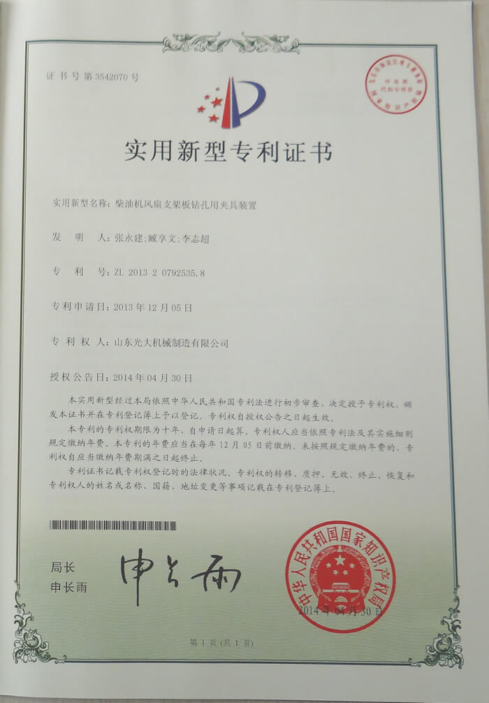 柴油机风扇支架板钻孔用夹具装置-实用新型专利证书