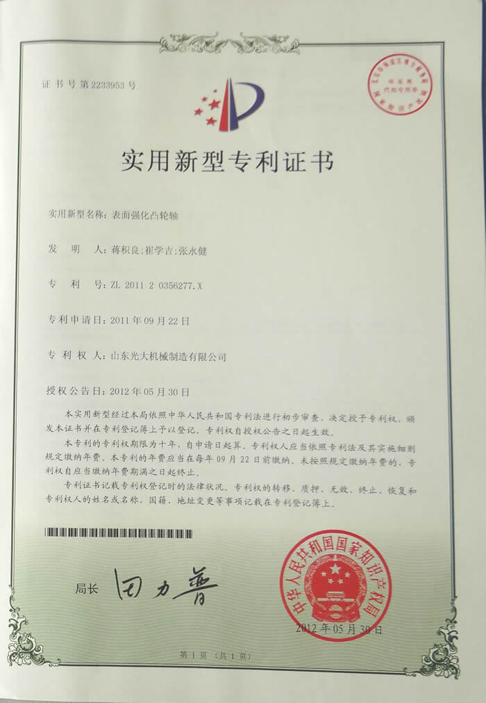 表面强化凸轮轴-实用新型专利证书